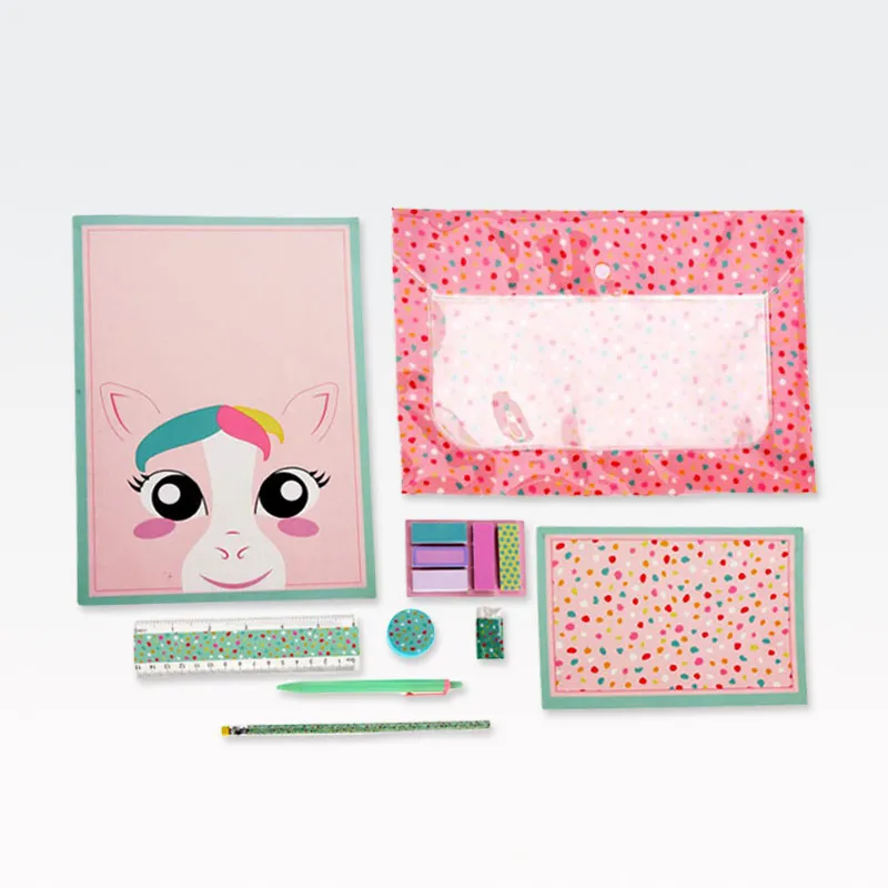 Pisalni set "Unicorn" z dimenzijami 33 cm v dolžino in 23 cm v širino je čudovit pisarniški komplet, namenjen ljubiteljem mitoloških bitij in vseh, ki cenijo pisane in domiselne pisarniške pripomočke. Ta set običajno vključuje različne elemente, kot so zvezki, pisala, svinčniki, radirke in ravnila, vsi pa so okrašeni z motivi samorogov in morda drugimi fantazijskimi elementi, ki dodajajo pridih čarobnosti vsakodnevnim opravilom.
