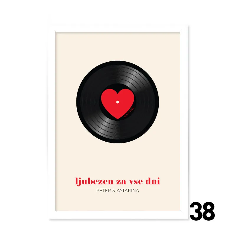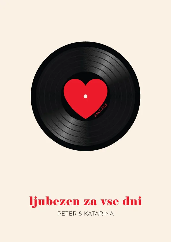 Diplomo krasi motiv vinilske plošče, ki simbolizira vajino edinstveno pesem ljubezni. Z možnostjo dodajanja imen obeh partnerjev ter leta, ko sta se spoznala, diploma postane čustven spomin na začetek skupne poti in trenutek, ki je za vedno spremenil vajini življenji.