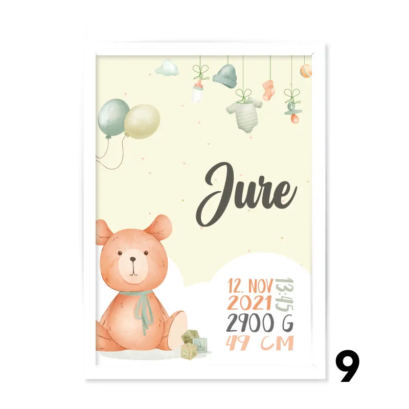 Okrasite stene otroške sobice s krasnimi personaliziranimi grafikami z rojstnimi podatki in ljubkimi motivi.
