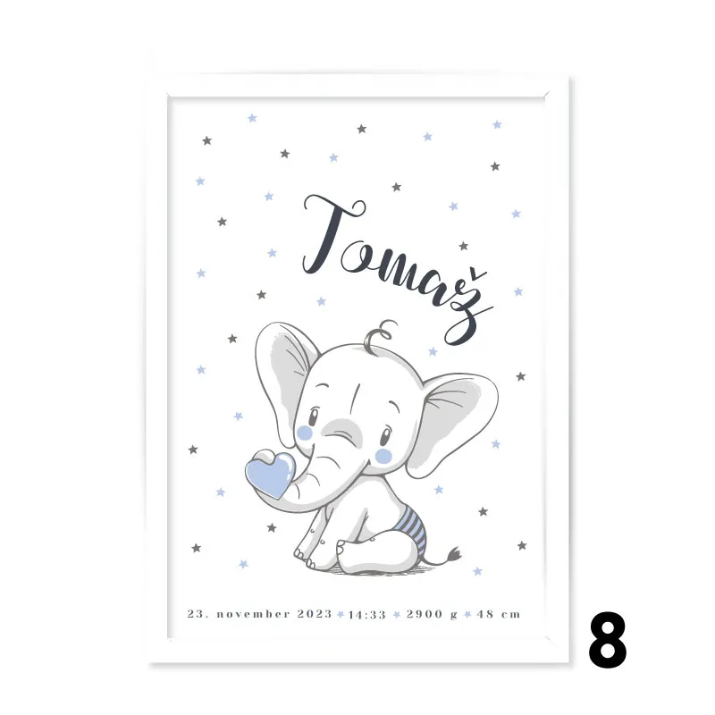 Okrasite stene otroške sobice s krasnimi personaliziranimi grafikami z rojstnimi podatki in ljubkimi motivi.
