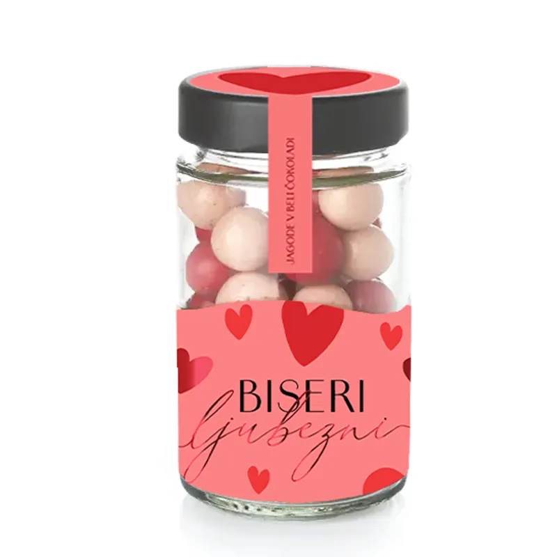 Dražeji BISERI LJUBEZNI so popolna kombinacija elegance in razvajanja. Sladke jagode, obdane z nežno belo čokolado, so oblikovane v drobne dražeje, ki očarajo tako z okusom kot z videzom. Zapakirani v lično stekleničko so idealno darilo za ljubljeno osebo, majhna pozornost ob posebnih trenutkih ali sladek dodatek k večjemu darilu.