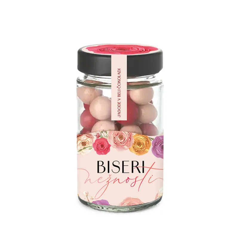 Dražeji v steklenički, BISERI NEŽNOSTI, jagode v beli čokoladi, 125 g