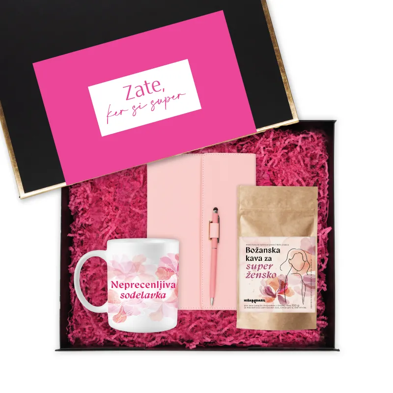 Navdihujoče darilo, ustvarjeno za sodelavke, ki vsak dan prispevajo nekaj posebnega. Paket vsebuje kakovosten popolno kombinacijo za prijeten in produktiven delovni dan. S sporočilom »Zate, ker si super« izraža iskreno zahvalo, spoštovanje in pozornost.