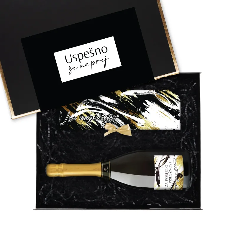 Elegantno in praznično poslovno darilo, namenjeno vsem, ki stopajo v nove uspehe. Paket vsebuje buteljko penine za slavje dosežkov in vrhunsko čokolado za sladek zaključek leta. S sporočilom »Uspešno še naprej« je popolna izbira za poslovne partnerje, ekipe ali sodelavce, s katerimi želite nazdraviti novim priložnostim.