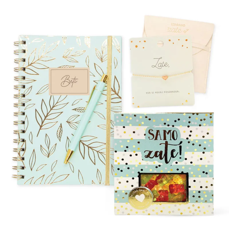 - zapestnico Zate, ker si nekaj posebnega, v zlati barvi iz nerjavečega jekla, v darilnem žepku