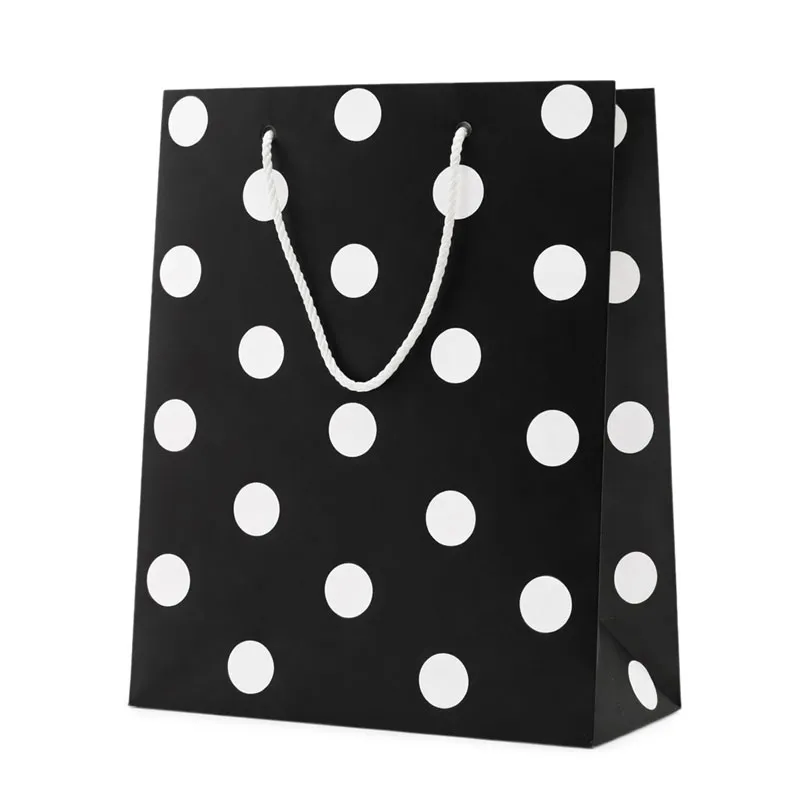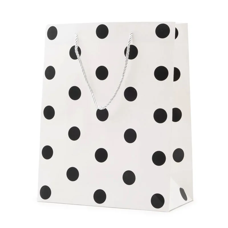 Elegantna darilna vrečka v črno-beli kombinaciji s pikami je odlična izbira za moderno in stilno pakiranje daril. Na voljo je v dveh različicah – bela vrečka s črnimi pikami ali črna vrečka z belimi pikami, kar daje darilu preprost, a hkrati privlačen videz. Primerna je za rojstne dneve, praznike, poslovna darila ali druge posebne priložnosti.