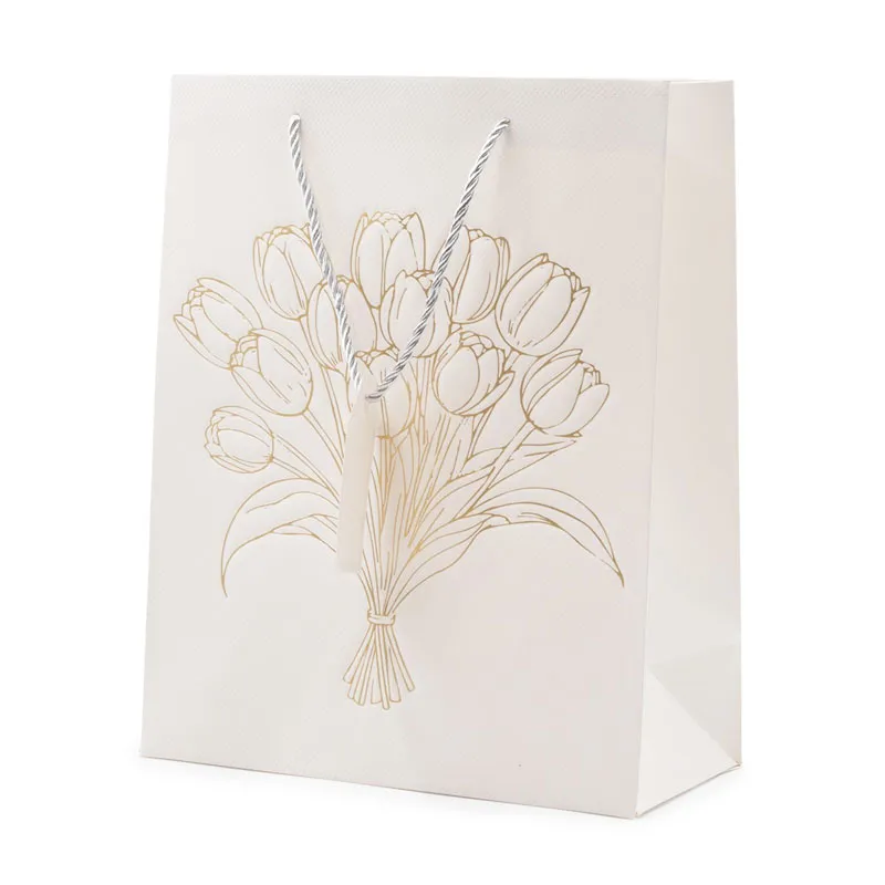 Elegantna darilna vrečka z motivom zlatih tulipanov je čudovita izbira za podarjanje daril ob različnih priložnostih. Enobarvna podlaga v kombinaciji z nežnim cvetličnim motivom v zlati barvi ustvarja prefinjen in eleganten videz, ki je primeren za rojstne dneve, obletnice, materinski dan, praznike ali druge posebne trenutke.