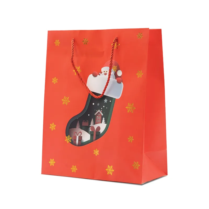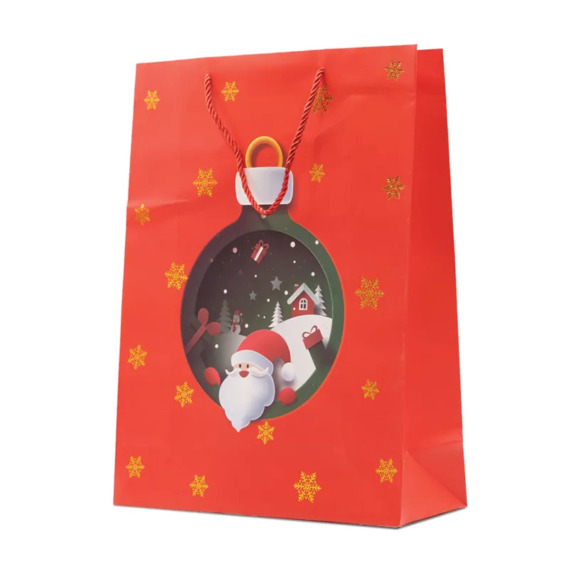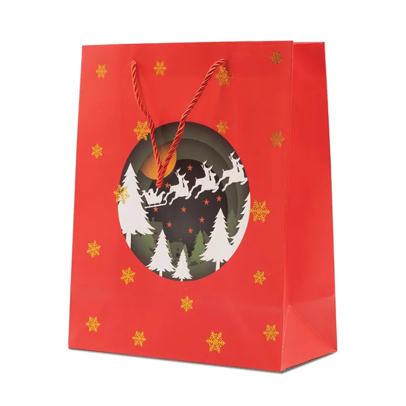 Darilna vrečka rdeče barve z zlatimi snežinkami in čudovitimi 3D motivi, kot so božiček, snežne sani in božična vas, je popolna izbira za praznično obdarovanje. Bogat tridimenzionalni motiv daje vrečki poseben praznični čar in občutek razkošja. Izdelana je iz kakovostnega papirja, primerna za darila različnih velikosti. Vaše darilo bo s to vrečko videti še bolj posebno in praznično.