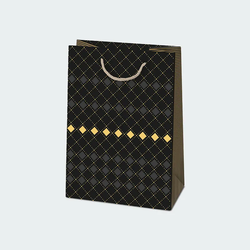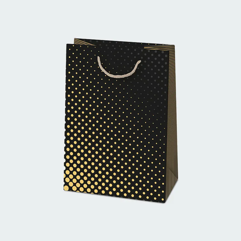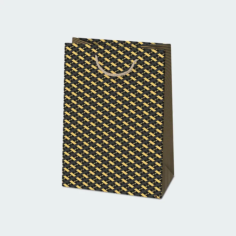 Črna barva vrečke zagotavlja klasično in sofisticirano osnovo, ki jo vzorci dodatno obogatijo. Ti vzorci so lahko raznoliki - od preprostih in elegantnih geometrijskih oblik do bolj kompleksnih in umetniških motivov. Takšna darilna vrečka je primerna za številne priložnosti, vključno z rojstnimi dnevi, obletnicami, porokami ali poslovnimi darili.
