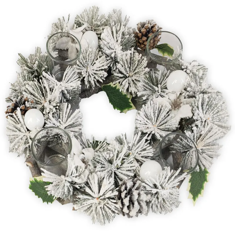 Okrogel adventni venček s steklenimi svečniki je čudovit praznični okras, ki v dom vnese toplino in čar adventnega časa. Venček je bogato okrašen z različnimi barvnimi dodatki, kot so pentlje, kroglice in naravni elementi, ki ustvarjajo harmoničen in prazničen videz. 4 stekleni svečniki omogočajo varno postavitev sveč ter čudovito poudarijo svetlobo plamena. Popolna izbira za praznično mizo ali kot osrednji okras doma v času adventa.