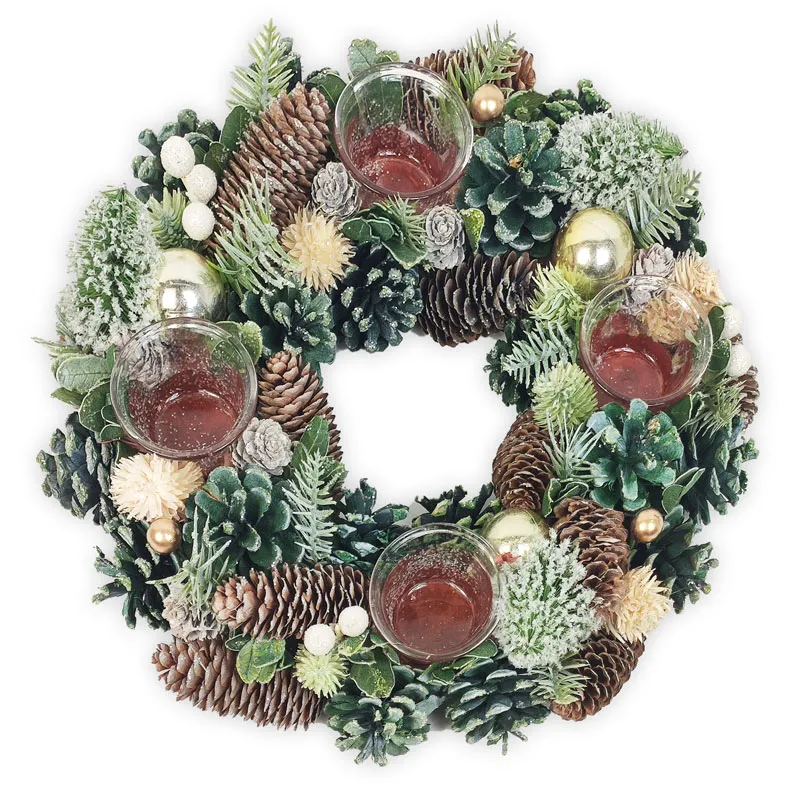Okrogel adventni venček s steklenimi svečniki je čudovit praznični okras, ki v dom vnese toplino in čar adventnega časa. Venček je bogato okrašen z različnimi barvnimi dodatki, kot so pentlje, kroglice in naravni elementi, ki ustvarjajo harmoničen in prazničen videz. 4 stekleni svečniki omogočajo varno postavitev sveč ter čudovito poudarijo svetlobo plamena. Popolna izbira za praznično mizo ali kot osrednji okras doma v času adventa.