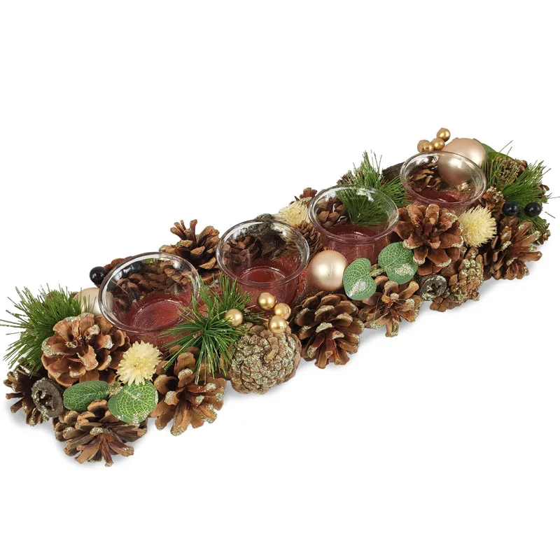 Podolgovat adventni venček s steklenimi svečniki je eleganten in sodoben dodatek, ki bo v vaš dom vnesel praznično toplino in čar adventnega časa. Venček je oblikovan v podolgovati zasnovi, kar ga naredi idealnega za okrasitev mize ali komode. Stekleni svečniki omogočajo varno postavitev sveč in čudovito razpršijo njihovo svetlobo. Popoln je za ustvarjanje prijetnega, toplega vzdušja v času pričakovanja božiča.