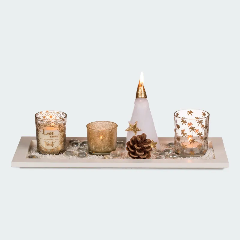 Set 4 sveč na lesenem pladnju, z dekoracijo, 36x14cm