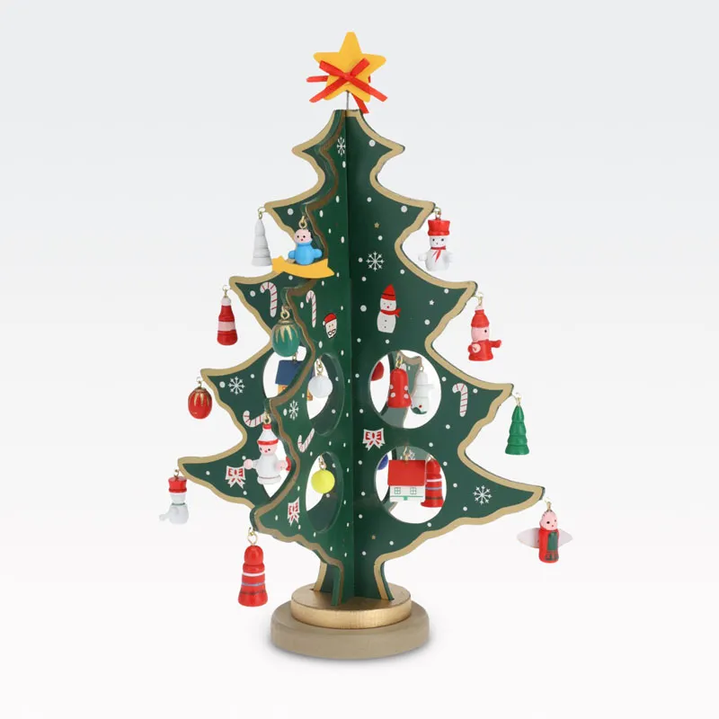 Ta božični dekorativni set vključuje lesen model božične smreke, ki je okrašen s priloženimi okraski in je visok približno 26 cm. Ta set je odličen za ustvarjanje praznične dekoracije za vaš dom med božičnimi prazniki.