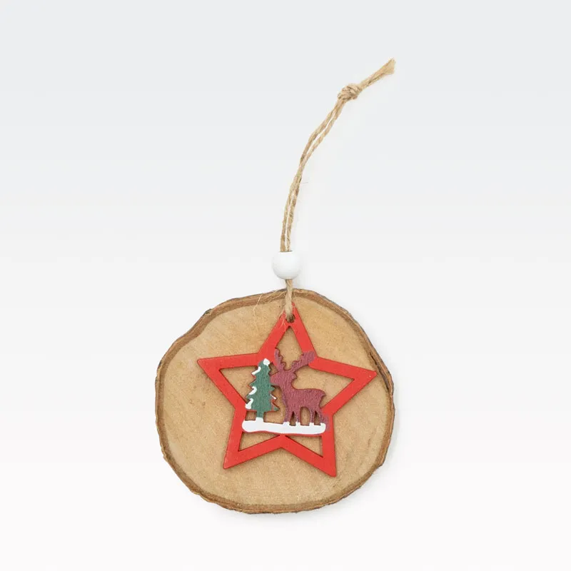 Obesek božični, lesen krog, zvezdica, pisana, MDF, 7.5cm