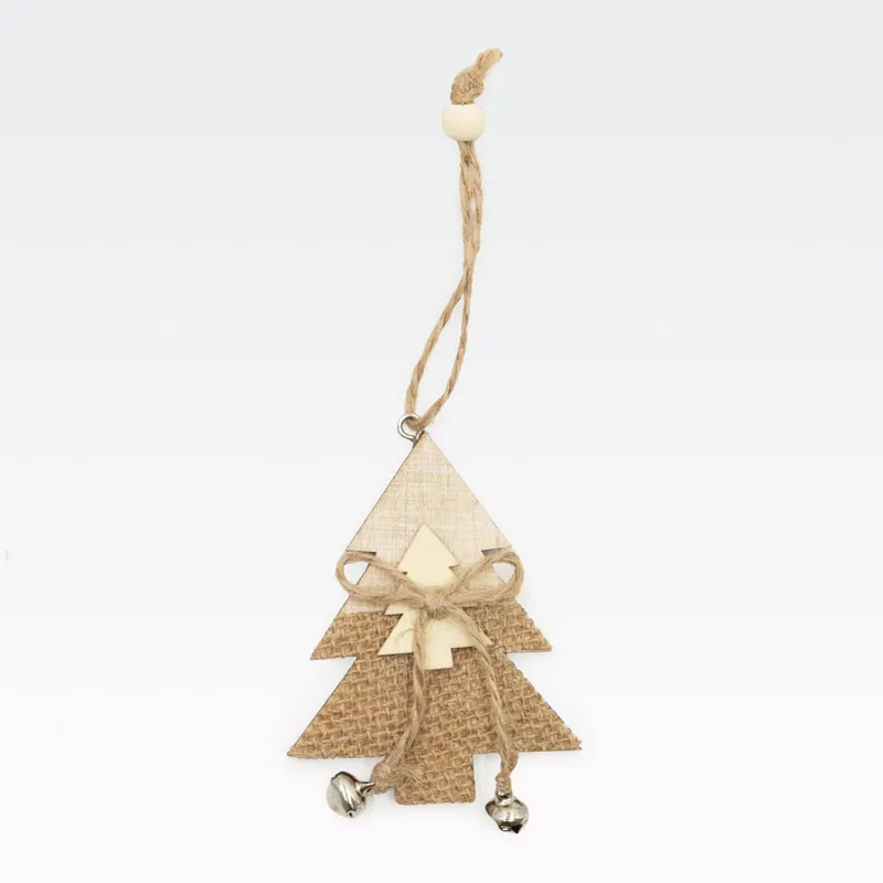 Obesek božični, smrekica, natur z juto in kraguljčki, MDF, 9-10cm