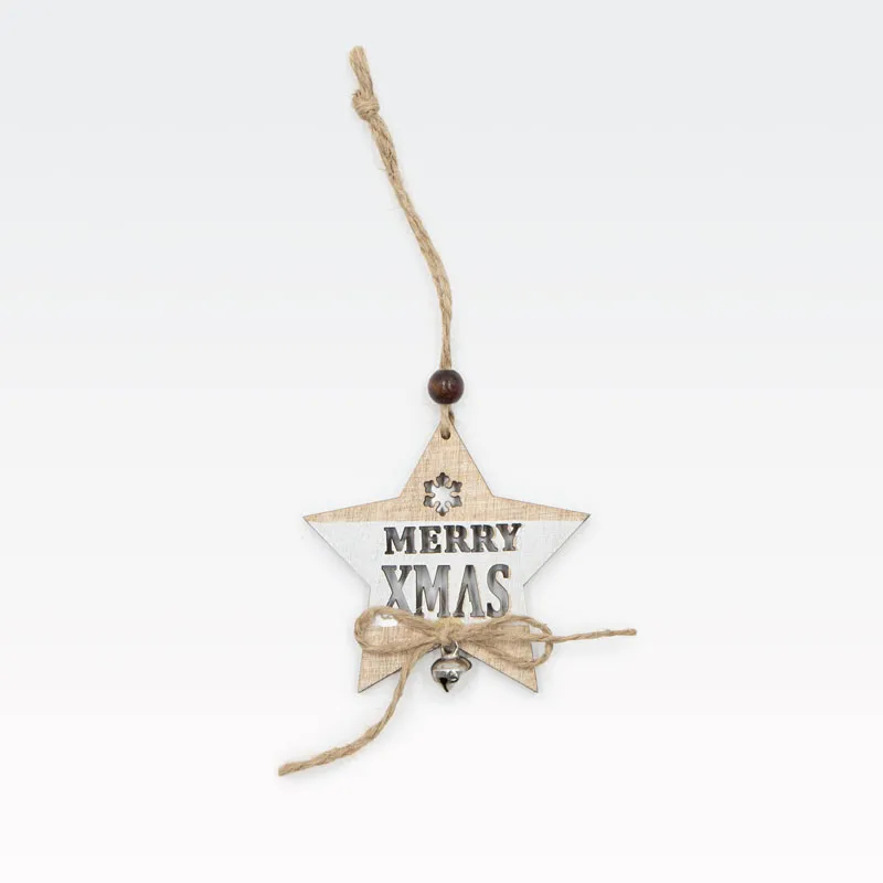 Obesek božični, zvezdica, Merry Xmas, natur, s kraguljčkom, MDF, 7.5cm