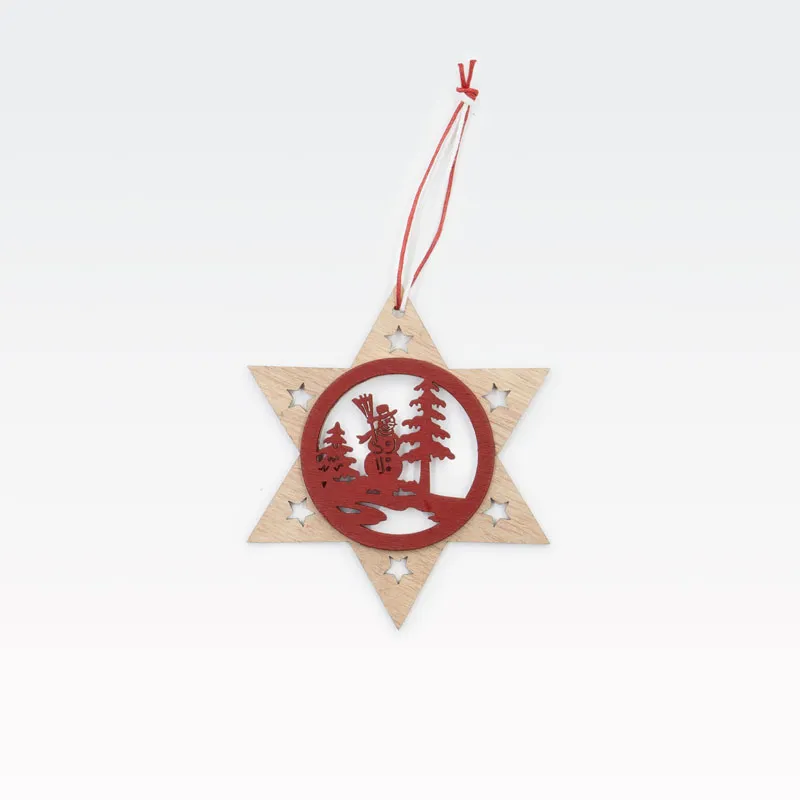 Obesek božični, zvezdica s snežakom, natur/rdeč, MDF,10cm,