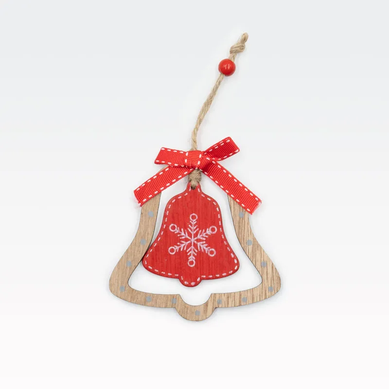 Obesek božični, zvonček, natur/rdeč, s pentljo, MDF, 9-10cm