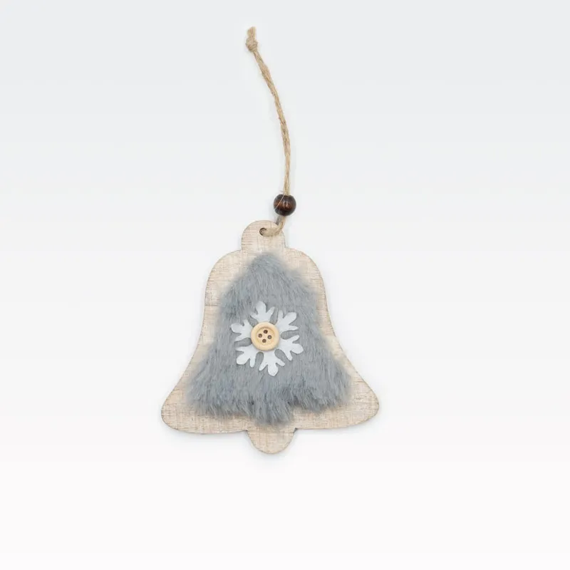 Obesek božični, zvonček s krznom, siv, MDF, 9-10cm