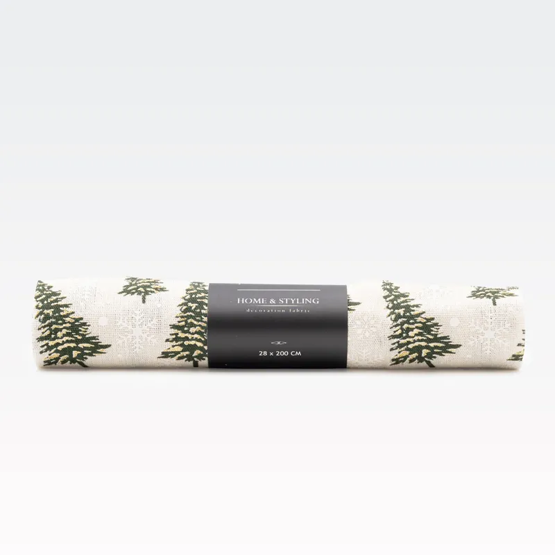 Blago na roli, božični motiv, belo z zelenimi božičnimi smrekami, 100% poliester, 28x200cm