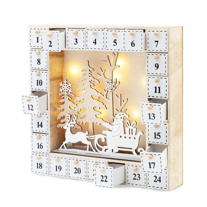 Ta čudovit adventni koledar z motivom Božička na saneh je popolna izbira za ustvarjanje prazničnega vzdušja in odštevanje dni do božiča. Izdelan iz visokokakovostnega MDF materiala, koledar združuje estetsko privlačnost in trpežnost, kar zagotavlja dol