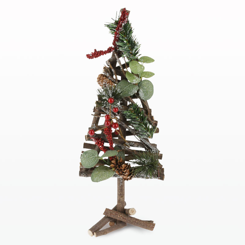 Božično drevo iz jelk, okrašenih s borovimi storži, rdečimi jagodami, storži in evkaliptusom.