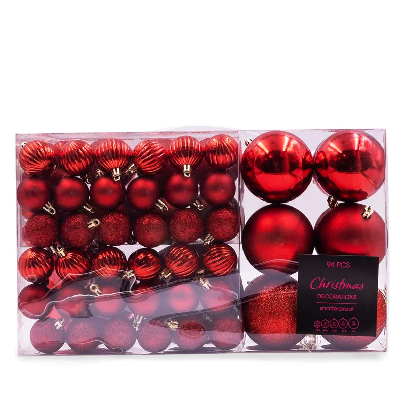 Ta komplet božičnih kroglic je sestavljen iz 94 božičnih kroglic rdeče brave, tako da je božično drevo takoj lepo napolnjeno. Okraski v tem kompletu so mat in sijoči ter z bleščečimi zaključki. S tem kompletom ustvarite čudovito božično vzdu&sca