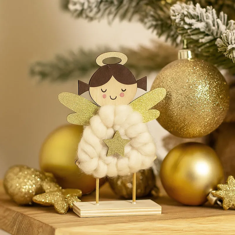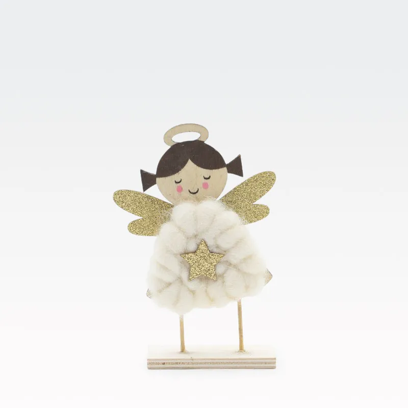 Punčka, angelček s krili, natur z belo volno, MDF, 16cm, sort.