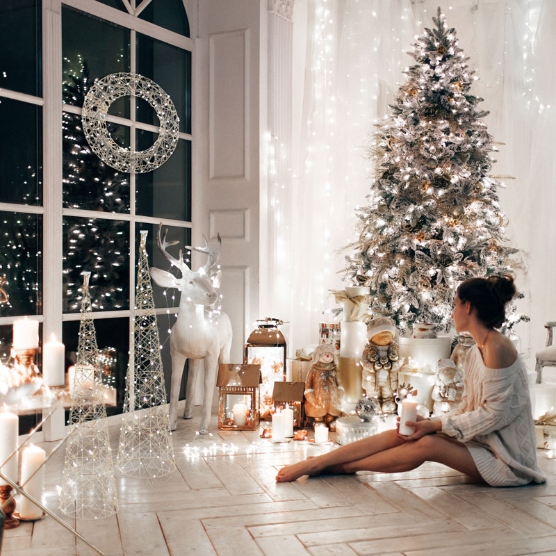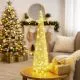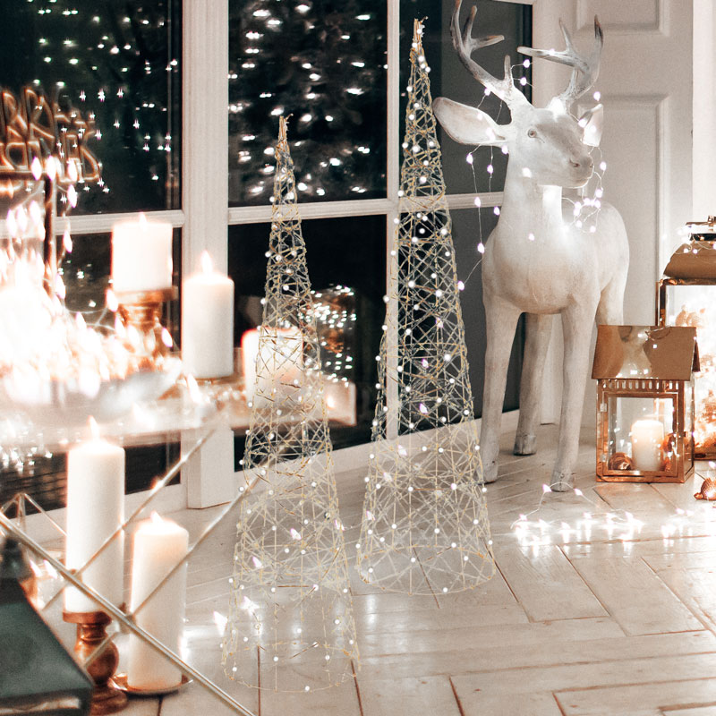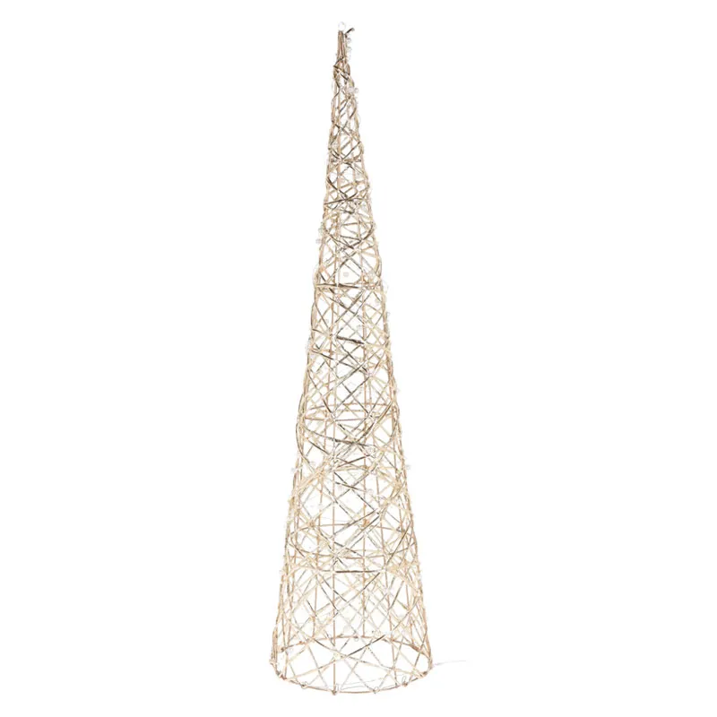 Božično drevo v obliki piramide zlate barve. izdelano iz vejic ratana. Dodatno je božično drevo prepleteno z okrasno verižico iz belih perlic. V notranjosti so LED lučke, ki ob vklopu božično drevo osvetlijo s toplim sijem. Dekoracijo lahko postavite k
