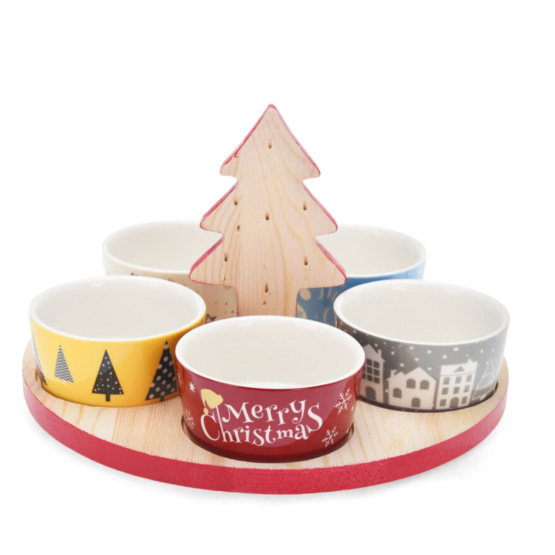 Set 5 servirnih skodelic na lesenem pladnju, keramika, božični motiv, sort.