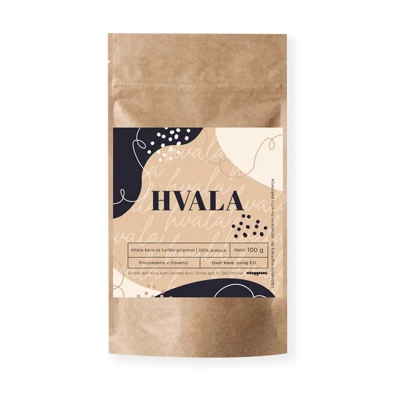 Elegantno pakiranje z napisom »Hvala« je popolno darilce za sodelavce, prijatelje, učitelje ali kogar koli, ki si zasluži iskreno zahvalo. Preprosto, pristno in z vonjem po sveže kuhani kavi.