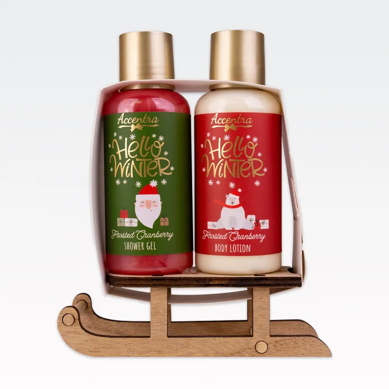 Kopalni set HELLO WINTER , božični, (100ml gel za tuširanje, 100ml losijon za telo), z vonjem Frosted Cranberry, v darilni embalaži na lesenih saneh