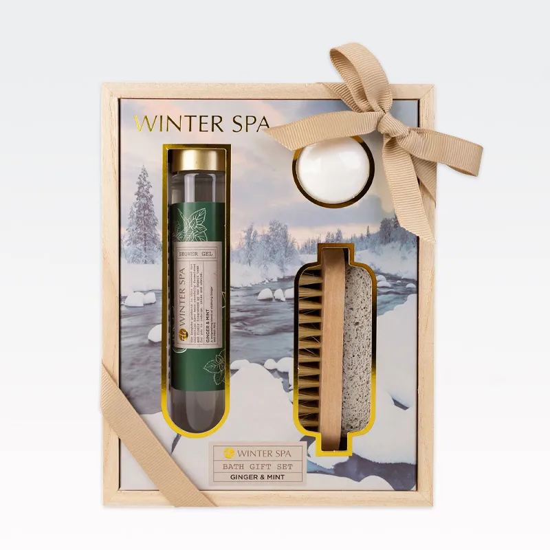 Kopalni set WINTER SPA, (60ml gel za tuširanje, 30g kopalna kroglica, krtačka za nohte), z vonjem Ginger & Mint, v leseni škatlici