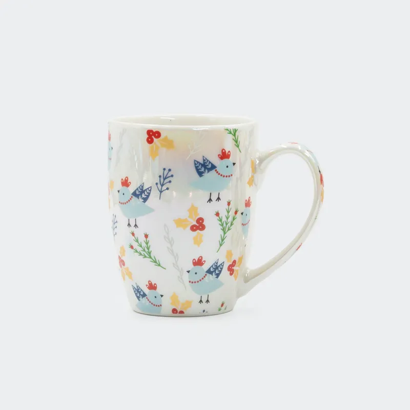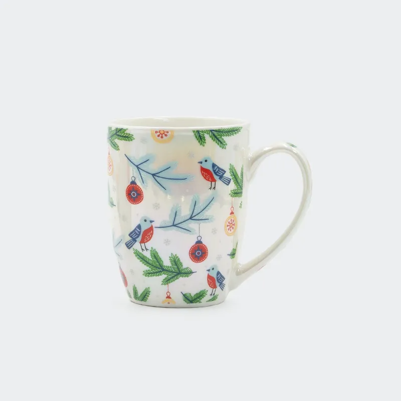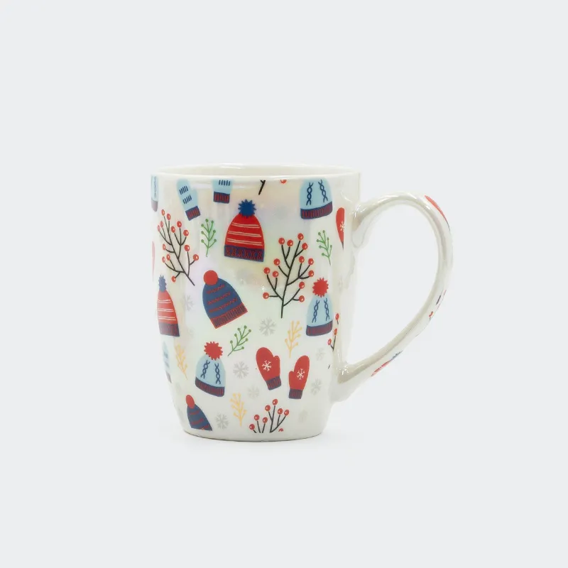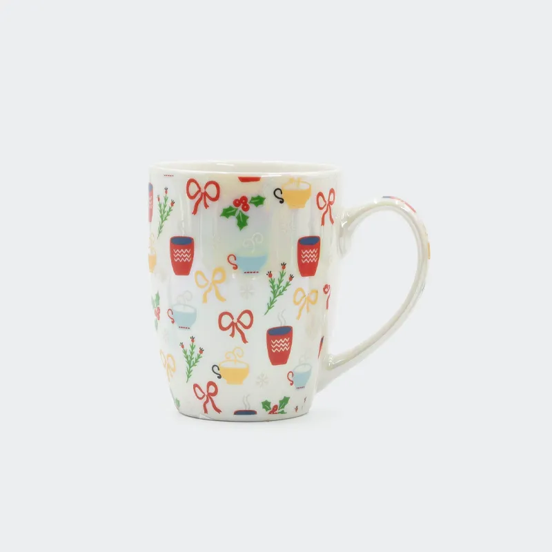 Lonček božični, bel z različnimi motivi, s svetlečim premazom, porcelan, 8x9.5cm, sort.
