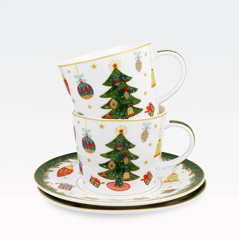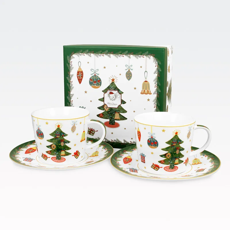 Set 2 skodelic s podstavkom, božični motiv, v darilni embalaži, AROUND CHRISTMAS TREE, 250ml, new bone, 7cm