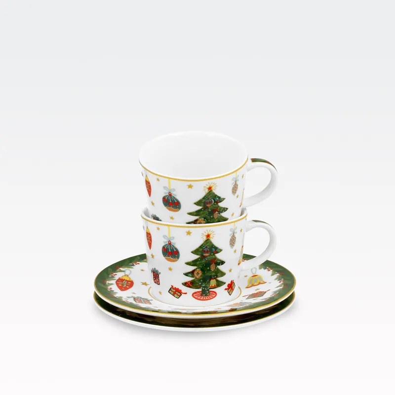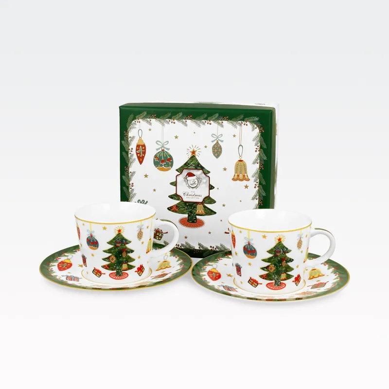 Set 2 skodelic za espresso s podstavkom, božični motiv, v darilni embalaži, AROUND CHRISTMAS TREE, 90ml, new bone, 5cm