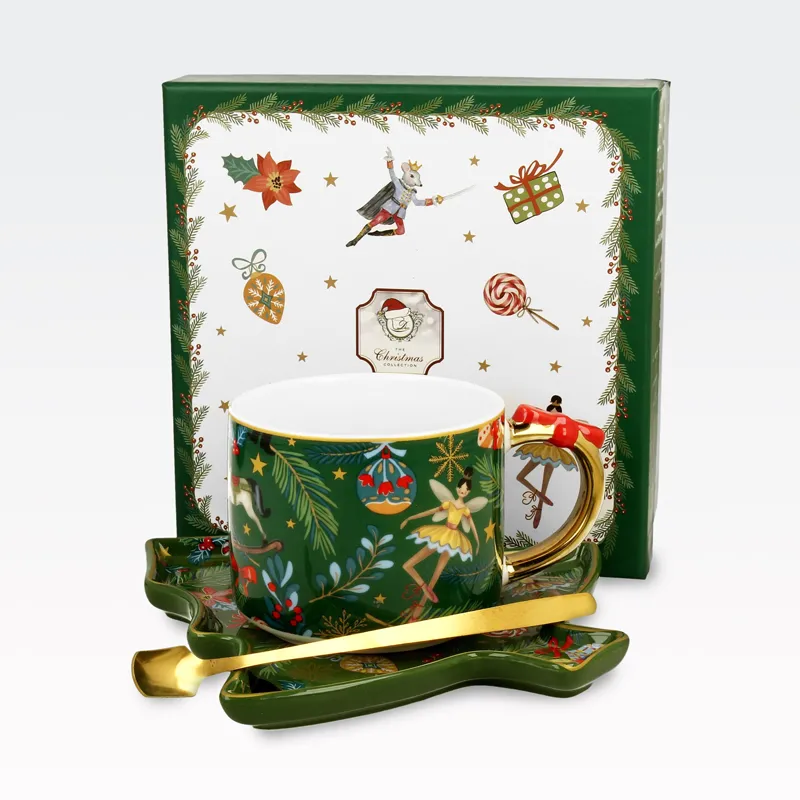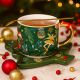 Skodelica s podstavkom v obliki božičnega drevesa z žličko, božični motiv, v darilni embalaži, CHRISTMAS SPIRIT, 250ml, new bone, 6.5cm