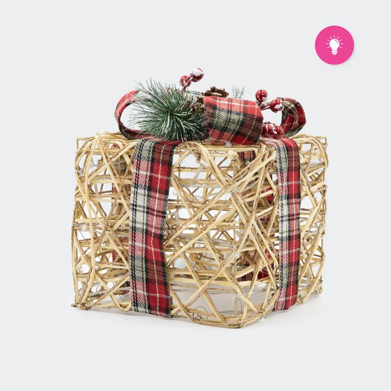 Dekoracija božična z led lučkami, v obliki darila, ratan s karirarsto pentljo, za notranjo uporabo, 30 LED, 8 funkcij, 20cm