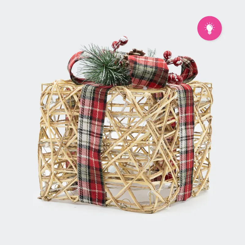 Dekoracija božična z led lučkami, v obliki darila, ratan s karirarsto pentljo, za notranjo uporabo, 30 LED, 8 funkcij, 25cm