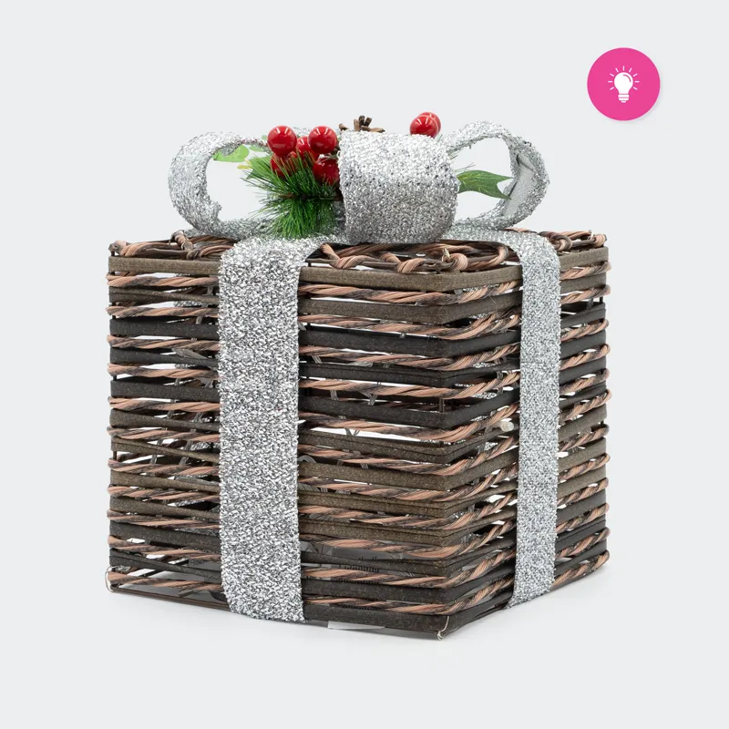 Dekoracija božična z led lučkami, v obliki darila, rjav ratan s srebrno pentljo, za notranjo uporabo, 30 LED, 8 funkcij, 20cm