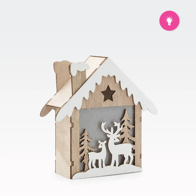 Hiška z jelenčki, božična dekoracija, z LED lučko, natur/bela, MDF, 15x13x4cm