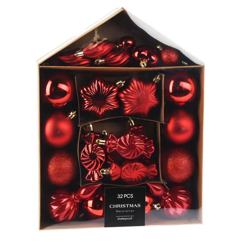 Krogle božične, rdeče, set 32/1, umetna masa, različne oblike in velikosti