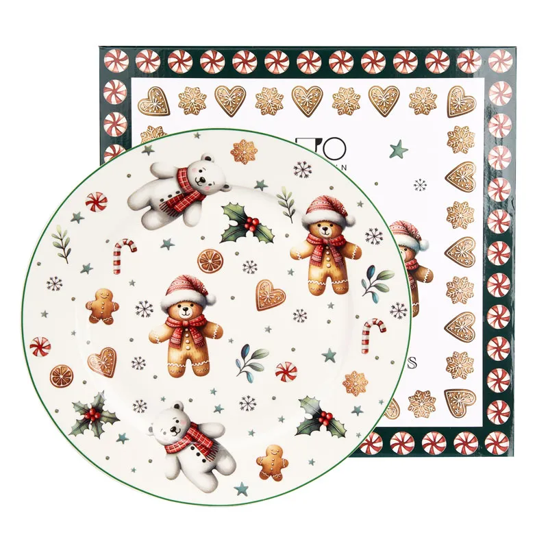 Krožnik z božičnim motivom v darilni embalaži z motivom božičnih medvedkov je prikupen praznični kos, ki v dom prinese toplino in veselje božičnih dni. Izdelan je iz kakovostne keramike in okrašen z ljubkim motivom medvedkov v prazničnem okolju, ki navduši otroke in odrasle. Lična darilna embalaža naredi krožnik popoln za obdarovanje v prazničnem času ali kot dekorativni element praznične mize.