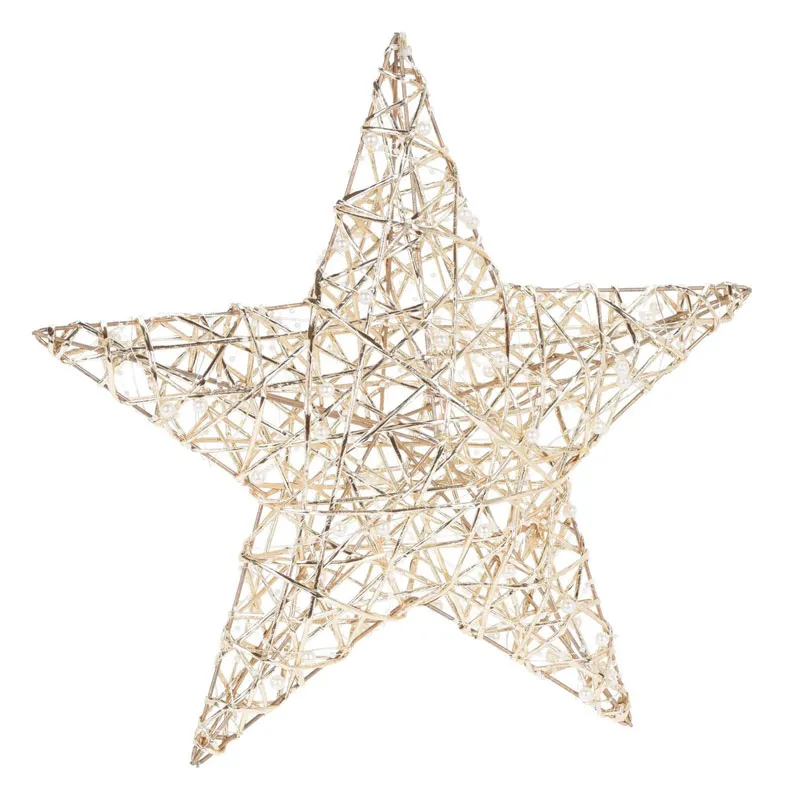 Ta viseča zvezda bo odlično dopolnilo vsaki dom. Zvezdo lahko obesite na vrata in tako širite čudovito praznično avro že na pragu. Ogrodje je kovinsko, prepleteno z okrasno vrvico in okrašeno s perlicami. Vse skupaj izgleda zelo stilsko i