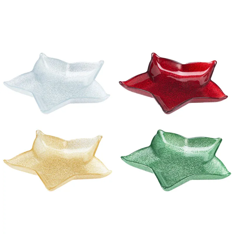 Steklen pladenj v obliki zvezde je eleganten in vsestranski dekorativni kos, ki s svojo obliko in sijajem vnese praznični pridih v vsak prostor. Izdelan je iz kakovostnega stekla in je na voljo v različnih barvah, kar omogoča popolno uskladitev z vašo praznično dekoracijo. Zaradi svoje zvezdaste oblike in sijoče površine je primeren za serviranje slaščic, sadja, prigrizkov ali kot podlaga za sveče in druge dekorativne elemente. Popoln dodatek za praznično mizo ali eleganten okras skozi vse leto.