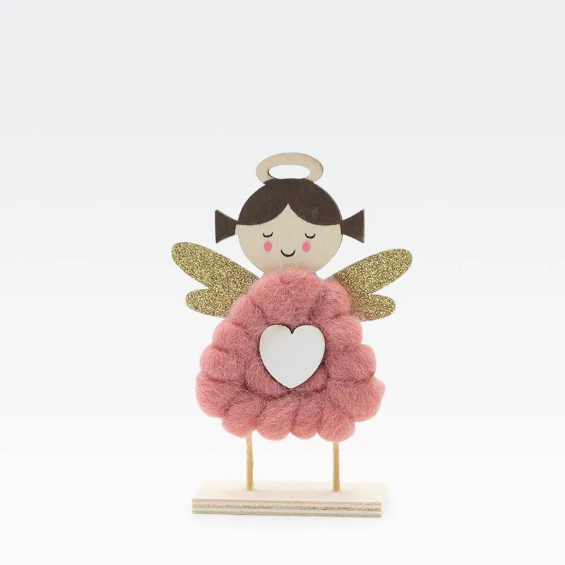 Punčka, angelček s krili, natur z roza volno, MDF, 16cm