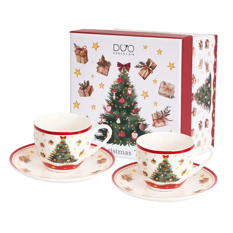Set dveh espresso skodelic s podstavkoma v darilni embalaži z motivom božičnega drevesca je popolno praznično darilo za vse ljubitelje kave in božičnega vzdušja. Skodelici iz kakovostne keramike krasita čudovit motiv božičnega drevesca in praznični detajli, ki pričarajo toplino doma in praznično razpoloženje. Priložena podstavka dopolnjujeta eleganten videz kompleta, lična darilna embalaža pa poskrbi, da je komplet pripravljen za podarjanje.