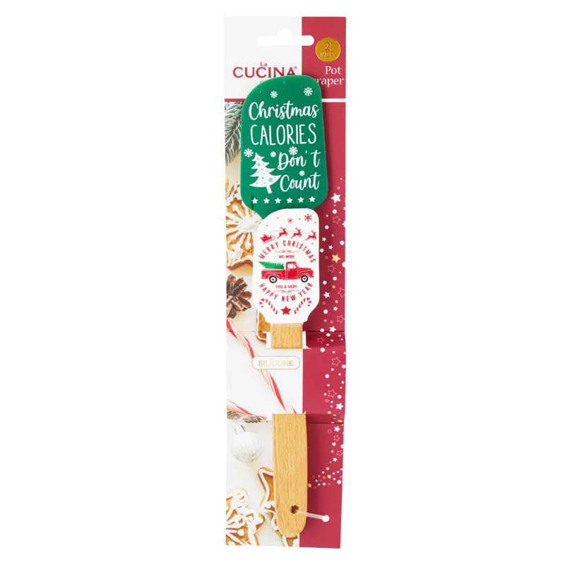 Set dveh silikonskih spatul z božičnim motivom je prikupen in praktičen kuhinjski pripomoček, popoln za praznično peko in pripravo slaščic. Spatuli sta izdelani iz kakovostnega silikona, odpornega na toploto, z lesenim ročajem za udoben oprijem. Okrašeni sta z veselimi božičnimi motivi, kot so Božiček, snežinke ali jelenčki, ki pričarajo praznično razpoloženje tudi v kuhinji. Odličen komplet za praznično peko ali kot darilo ljubiteljem kuhanja in peke.