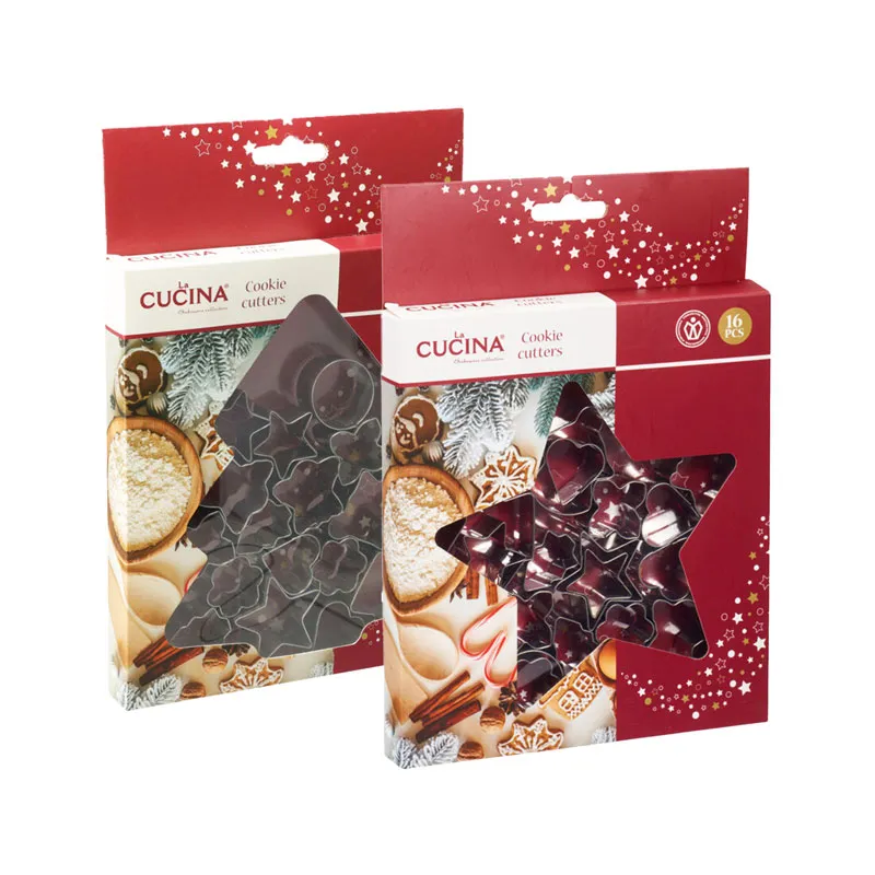 Set kovinskih modelčkov za izdelovanje piškotov je nepogrešljiv pripomoček za peko domačih slaščic. V kompletu je več modelčkov različnih oblik – zvezdice, srca, smrečice, snežinke in druge praznične oblike, ki omogočajo ustvarjanje popolnih piškotov za vsako priložnost. Izdelani so iz kakovostne kovine, ki zagotavlja dolgo obstojnost in enostavno čiščenje. Idealen komplet za praznično peko z otroki ali ustvarjalno popoldne v kuhinji.